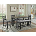 The Martin 6PC Counter Height Dining Set is the perfect addition to your home! This set includes a table, four side chairs, and bench. The rectangle table design will make it an easy fit in your home. The chairs feature a ladder back design and an upholstered seat in a grey fabric. The wire brush, black finish on the table base and chairs is truly unique, adding instant flair to this set. The table's two-tone finish will give the updated look your dining room has been craving! Features: • Includes Table, Four Chairs & Bench • Counter Height • Rectangle Table • Contrasting Two-Tone Table Finish • Ladder Back Chairs • Grey Upholstered Seats • Wire Brush Finish • Ships in One Box • Due To Lighting, Product Color May Slightly Vary From Images Weight: 169.0 lbs.
