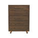 Adorn your bedroom with the charming mid-century modern style of the Brisbane Chest with LED in Brown. Crafted from solid wood and a high-quality walnut veneer, this piece is as durable as it is stylish. Spacious drawers offer ample space for storing your essentials, and a top drawer with protective felt lining reflects thoughtful design. Minimalist, wood drawer handles and a double pedestal base add charming detail, while LED lighting enhances the piece's visual aesthetic. For a timeless, durable, and stylish addition to your bedroom, the Brisbane Chest with LED is an ideal choice. Features: • Made of Durable Solid Wood with Quality Walnut Veneer • Drawers with Skillful Dovetailing & Ball-Bearing Glides • LED Underlighting Enhances Aesthetic • Minimalist Design Marks Mid-Century Modern Style • Top Drawer with Protective Felt Lining • 38"W x 19"D x 52"H • Due to Lighting, Product Color May Slightly Vary from Images Dimensions: Depth: 18.0" x Width: 38.0" x Height: 52.0" Weight: 173.0 lbs.